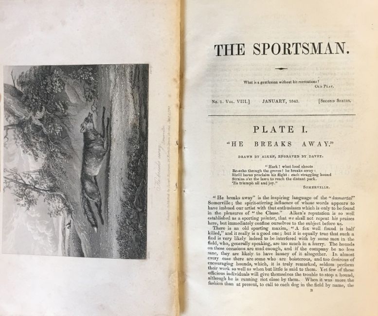 The Sportsman Book 1843 Vol VIII January to June published Joseph Rogerson London, illustrated with engravings, HB, bound in cloth, wear to covers, internally clean and appears in good condition