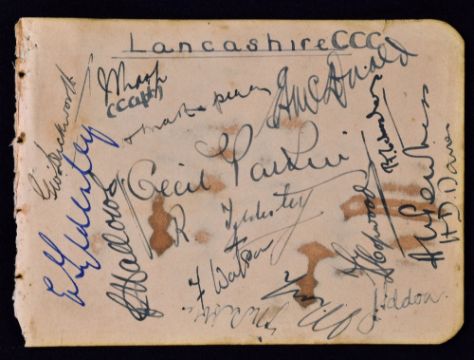 c.1930s Lancashire Cricket Autographs to include Cecil Parkin, Ernest Tyldesley, Peter Eckersley, Frank Watson, George Duckworth, Charles Hallows, Harry Donald Davies, John Hopwood, Richard Tyldesley, John Sharp, Alfred Pewtress, Frank Sibbles, and E McDonald, all signed in ink to an album page, few marks but autos appear clear