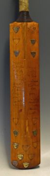 Sykes Maurice Leyland Junior Cricket Bat: Autographed to rear by an unidentified team having 10 silver shields dating from 1945 to 1961 with winners’ names Wells, Howells, St Margarets, Her Majestys missing 7 shields maybe a school trophy