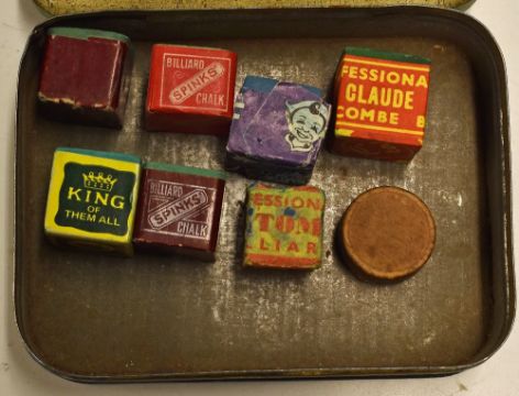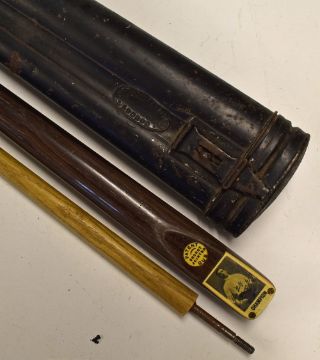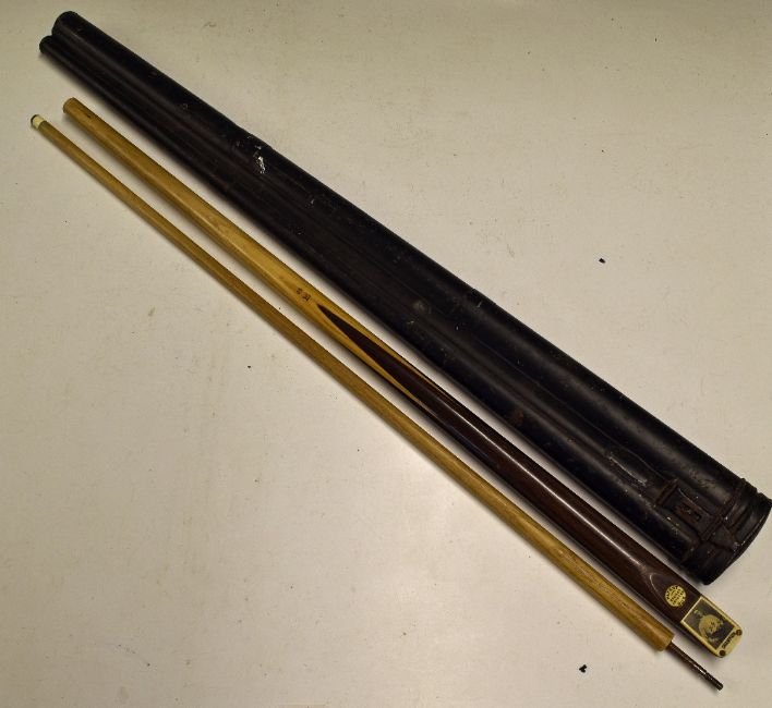 Burroughs and Watts ‘Champion’ Portable Billiards Cue a two piece cue in plain ash with ebony butt, with screw tip, 16oz, ‘Patent Secret Jointed Cue’ and marked with inlaid ivory plate depicting Melbourne Inman with facsimile signature and ‘Champion’ to butt end, encased within a two compartment black japanned case with hinged lid, marked Burroughs and Watts, measures 146cm approx. – overall a nice example together with 8x Snooker chalks , an early round example, Spinks, Elf, Claude Falkiner, Tom Newman etc, all encased within Pontefract Cakes Tin