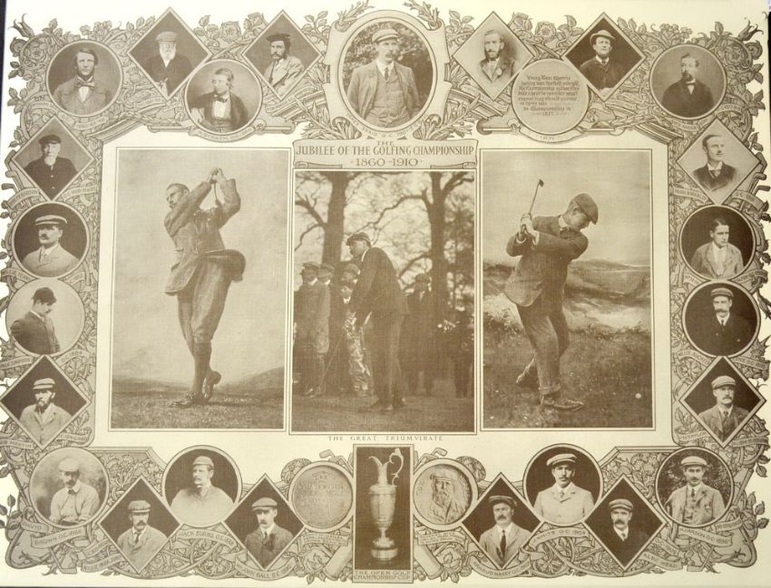 1910 50th Open Golf Championship Print – THE JUBILEE OF THE GOLFING CHAMPIONSHIP 1860-1910 - featuring the Great Triumvirate Vardon, Braid and Taylor to the centre and head shoulder portraits of every winner from Wm Park Snr 1860 – James Braid 1910 – image 15.5” x 19.75” – mf&g overall19 x 24”