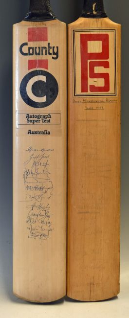 2x Australian Signed Cricket Bats with 12 signatures featuring A Border, G Marsh, P Taylor, M Taylor, I Healy, and more, together with an Andy Brassington Benefit Year 1988 Signed bat, with signatures of Gloucestershire and Sussex teams (heavy fading) worth inspecting (2)