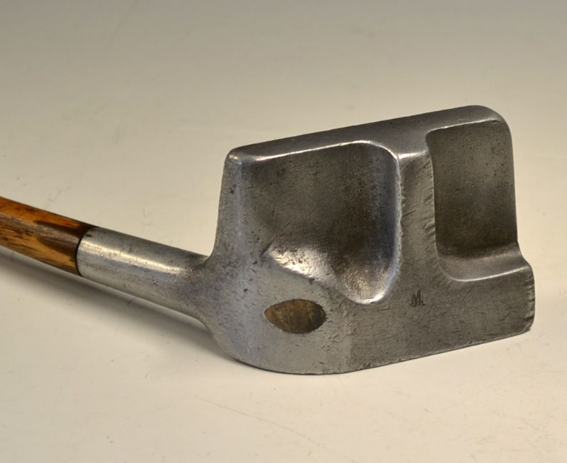 Rare and unique large square head alloy putter – with bore thro shaft – recessed sole with central bar stamped W. – the head measures 3.5” x 2 3/8” x 1” overall length 35”
