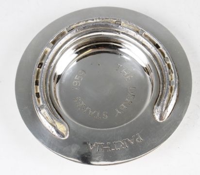 Unique 1959 Derby Winner polished racing plate mounted on Silver Dish – the dish engraved ‘Parthia’ and ‘The Derby Stakes 1959’ to the centre and on the reverse ‘A.P.B’ (Andrew Parker Bowles) – overall 15cm Dia’, hallmarked London 1967. Note: Vendor was previously employed by the Parker Bowles in the early 1980s and gifted the silver plate by Ann Parker Bowles.
