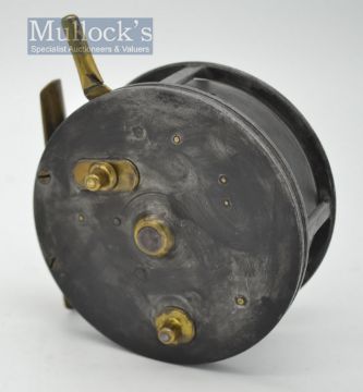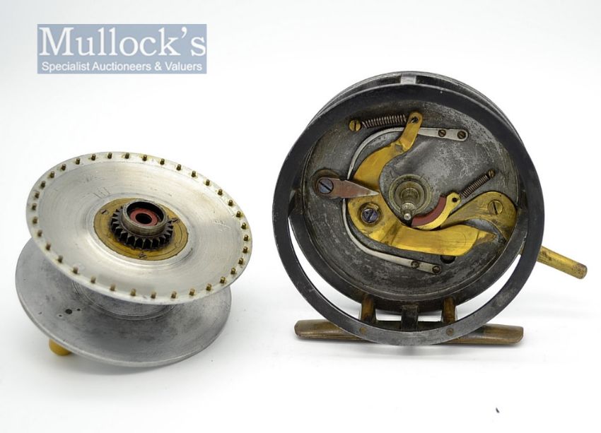 Very rare C Farlow & Co London Patent large alloy salmon reel: 4.1/8” dia, smooth brass foot, 3x screw brass drum release latch, brass rim lever brake handle, brass on/off back plate button and sliding back plate brake – alloy rear drum flange features tiny brass pillars 0.25” spacing – back plate stamped with patent number 16545 1909 – spins very freely – some random dark lead finish – but can’t see any restoration or repairs – come in Roger for your thoughts