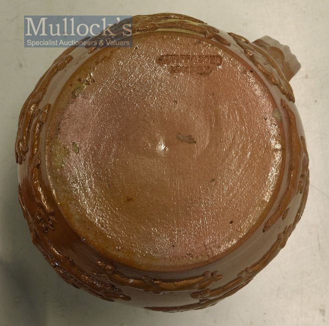 Scarce J Stiff and Sons Lambeth London Stoneware Pottery Bulbous Jug marked with maker’s mark to bottom, with figure and animal raised reliefs, measures 14cm approx. appears with no cracks and in good overall condition together with a Royal Doulton Kingsware Pitcher with Dickens Characters Mr. Pickwick, Mr. Pecksniff, Sydney Carton, Fagin, Sam Weller and Bill Sykes (repairs apparent to spout), raised reliefs along the body, a Royal Doulton Coffee Pot, a Royal Doulton ‘John Doulton’ Toby Jug, and tobacco barrel (missing lid) – condition overall appears A/G (5)