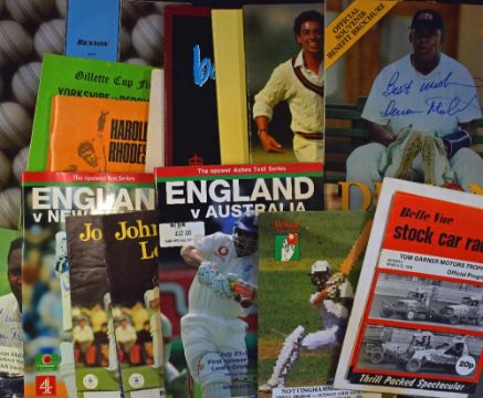 Collection of sports items to include cricket 1969 Gillette Cup Final programme Derbyshire v Yorkshire, 1988 Benson & Hedges Cup Final programme Derbyshire v Hampshire, 1968 Harold Rhodes testimonial programme, 1981 Nat West trophy champions (Derbyshire) brochure, 1992 Kim Barnett benefit brochure, 1993 James Whittaker benefit brochure (+ autograph), 1988 John Abrahams benefit brochure (+ autograph), Devon Malcolm benefit brochure (+ autograph), 1951 Derby cricket association handbook; 1979 St. Leger programme, plus stock car racing programmes and cricket programmes. (A Lot)
