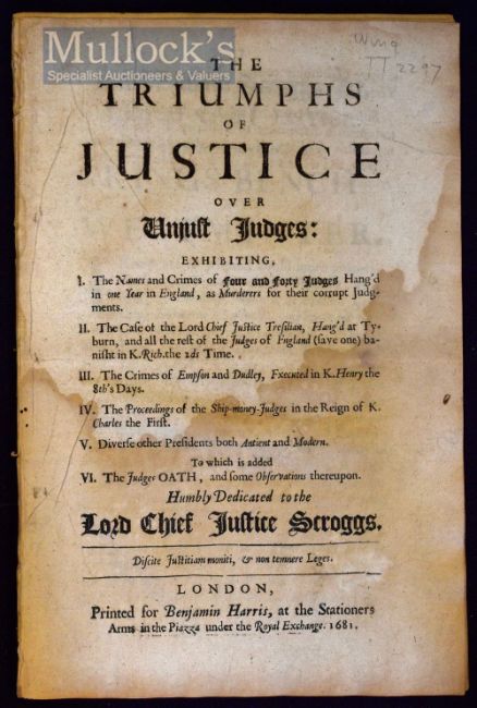 1681 ‘The Triumphs of Justice over Unjust Judges’ - exhibiting I. The names and crimes of four and forty Judges handed in one year in England, as murderers for their corrupt judgements, II. The case of the Lord Chief Justice Tresilian, and all the rest of the Judges of England (save one) banished in K. Rich. The IIs time, III. The Crimes of Empson and Dudley, executed in K. Henry VIII’s days, IV. The proceedings of the Ship-Money-Judges in the reign of K. Charles I, V. Diverse other Presidents both ancient and modern. To which is added VI. The Judges oath, and some observations thereupon. Humbly dedicated to the Lord Chief Justice Scroggs, printed London for Benjamin Harris 1681, written anonymously from Westminster Hall on 23rd Dec 1860 with a Preface addressed to Scroggs and in praise of his conduct and merits