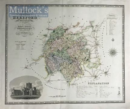 1834 C&I Greenwood Map of Hereford hand coloured with engraved view of Hereford Cathedral, measures 85x67cm approx., centre fold, tears to edges, does not encroach map, ready to frame