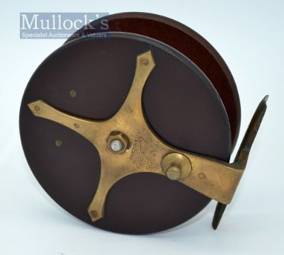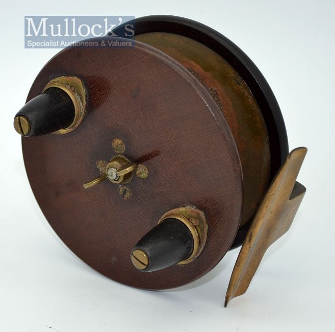 Ogden Smiths London “Fabros” fibre sea/boat reel – 4.5” dia, brass star back and rear drum plate, on/off check, butterfly central locking screw with embossed no.3 to the one wing – catches very slightly – foot slightly filed to one end - good strong check.