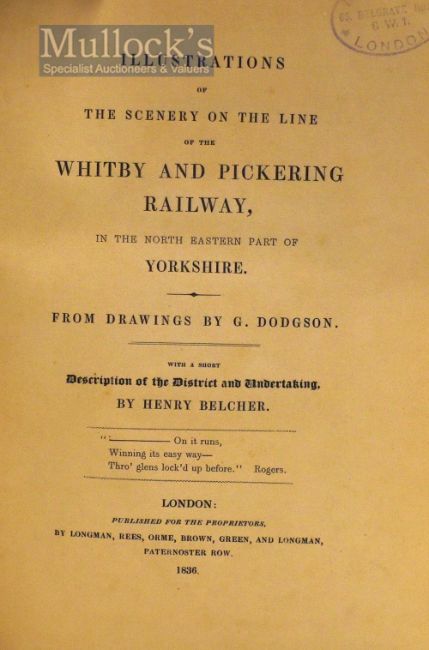 Whitby And Pickering Railway by Henry Belcher 1836 Book A 115 page book with several illustrations within the text. Interesting very early railway publication describing the views and places of interest along the 24 mile route where at this period, a type of horse drawn stage-coach ran along the rails. Also a detailed account of the railway’s opening during the same year. Mauve board cover. Larger format size 7” ´ 10”.