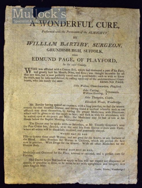 Suffolk - C.1810 ‘A Wonderful Cure’ Promotional Advert for Surgeon William Bartiby ‘performed with the Permission of the Almighty by William Bartiby, Suffolk upon Edmund Page of Playford’, advertising Bartiby’s medical practice and patent medicines, an interesting example, tear to top, creased etc, single sheet