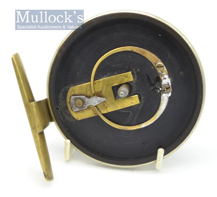 Slater Style combination ebonite and brass star back reel – 3.5” dia., nickel silver rear back plate rim - on/off check, brass drum core with alloy rear drum flange – tiny solder to spring check – some wobbling to spool