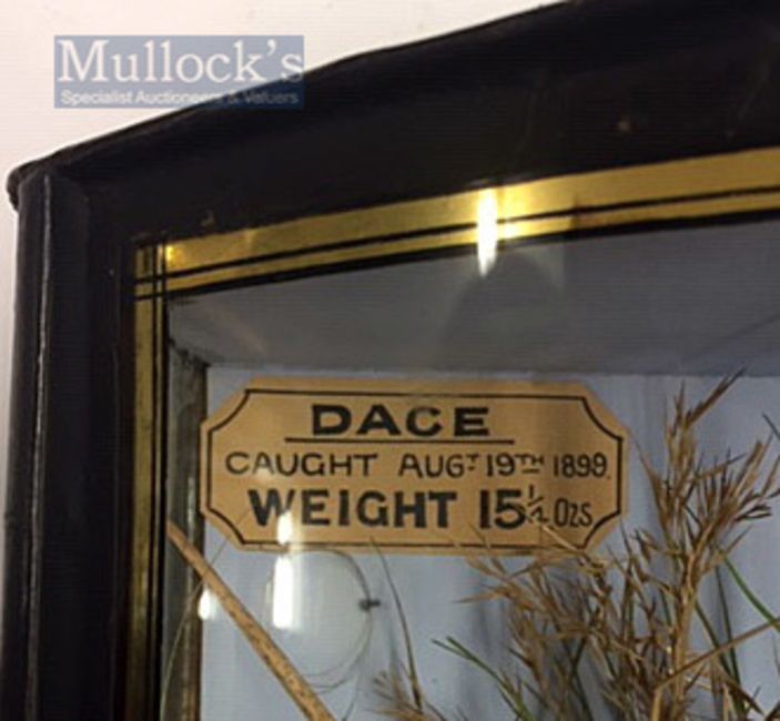Early J Cooper & Sons 28 Radnor Street preserved Dace dated 1899 - mounted in glass bow fronted case with makers label to the top right hand corner c/w detailed label to the top left hand corner inscribed “DACE –caught Augt 19th 1899- WEIGHT 15.25oz” overall 10” x 16.75”x 5.25” - note vertical crack to the back board otherwise very typical of era – all original