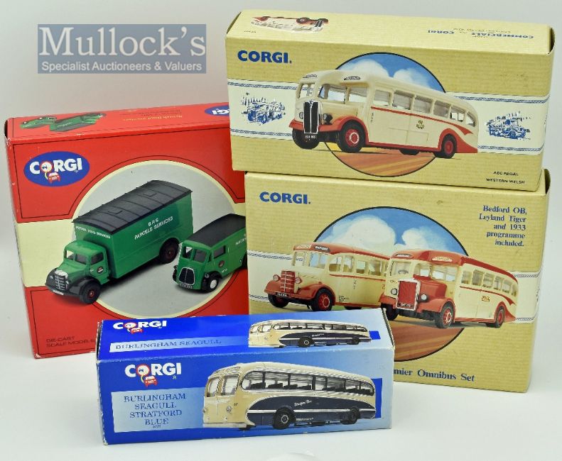 Corgi Toys Commercial Diecast Model Toys to include British Road Services 97200, 70th Anniversary Premier Omnibus Set Bedford OB and Leyland Tiger, Burlingham Seagull Stratford Blue, and Corgi AEC Regal Western Welsh – all boxed in good condition (4)