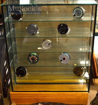 Glass fishing reel display case – with 6x shelves, sliding doors c/w wooden base or wall stand – cases measure 36.5 x 32 x 6.25”