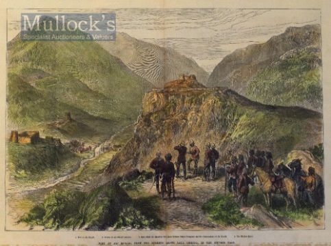 India – ‘Fort of Ali Musjid, From the Heights above Lal Cheena, in the Khyber Pass’ Original Engraving hand coloured from a sketch by Major Cavagnari and Major C.W. Wilson, with key and information below, mounted measures 68x50cm approx.