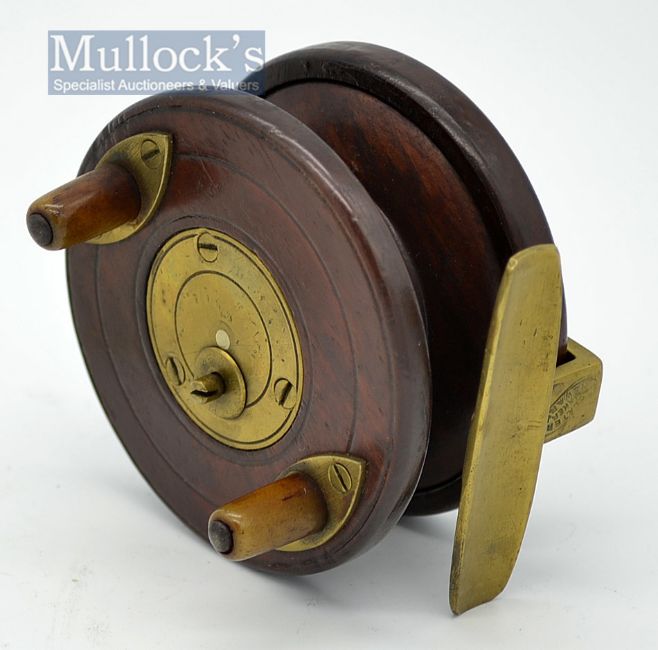 D Slater Nottingham wooden brass star reel – 3” dia with on/off check – foot lightly filed – spins nicely