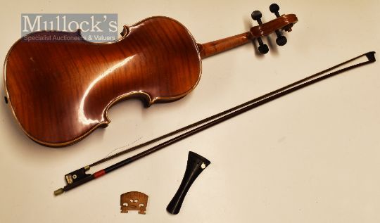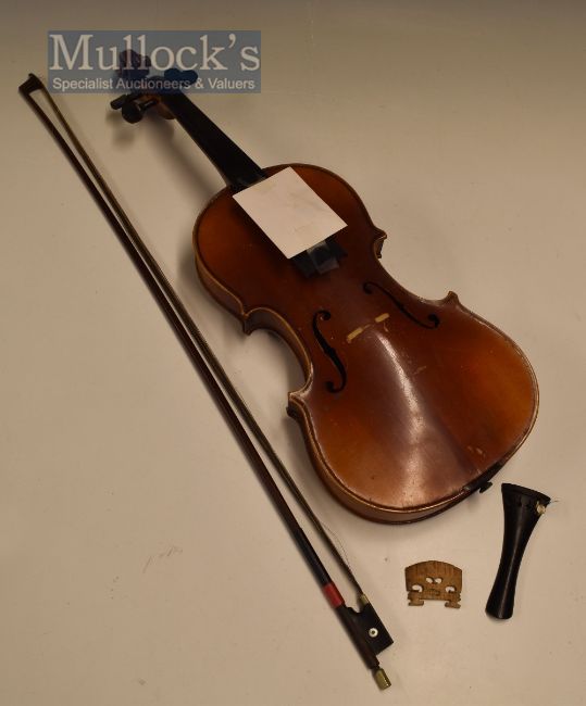 Musical Instrument - Michael Pötshcer Violin with internal label reads ‘musikalischer Instrumenten Macher aus Zwota anno 1929’ measures 60cm approx. without bridges and strings, appears with marks, with a loose bridge stamped ‘Aubert & Mirecourt’, in original case, and with a bow measuring 72cm approx. no apparent makers marks, with mother of pearl inlaid decoration – worth inspecting