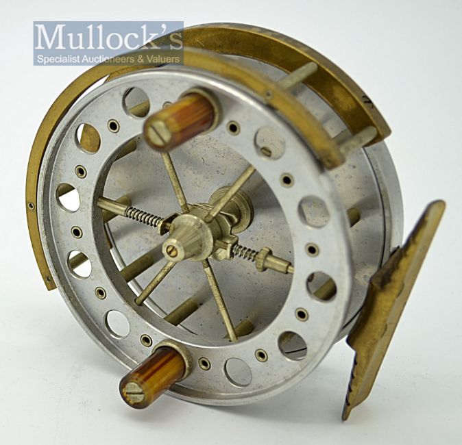 Richard Carter Roach Aerial centre pin reel – 3.5” dia – ribbed brass foot with RC engraved to the stem, and annular line guide, on/off check, pillared drum core – would appear unused and spins forever.