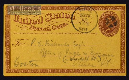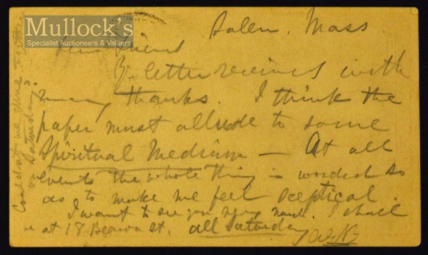 Autograph - Alexander Graham Bell (1847-1922) American inventor of the telephone Signed Postcard - on a pre-stamped postal card to P. D. Richards, a neighbour, friend, and scientific associate who collaborated with Bell in the development of early liquid transmitters that could transmit multiple telegraph messages Nov 30 [1887?] ‘Yr. letter received with my thanks. I think the paper must allude to some Spiritual Medium. At all events the whole thing is worded so as to make me feel sceptical [sic]. I want to see you very much. I shall be at 18 Beacon St. all Saturday.’ Along the left margin, Bell adds: ‘Couldn't we dine together on Saturday?’ with signature at end, Bell formed the Bell Telephone Company, and established the Volta Laboratory which produced numerous related inventions and improvements on existing technology. Measures 13x7cm approx.