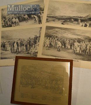 Life Association Golfing Prints set of 4x small official printed golfing scenes stamped Copy Right showing St Andrews surviving Open Champions 1905 Amateur Golf Championship at Sandwich 1904 Match at Duddingston 26th March 1898 (Tait and Balfour v Sayer and Auchterlonie) and North Berwick Perfection Hole 1910 c/w key to 3x prints overall 8.25 x 11” (6)