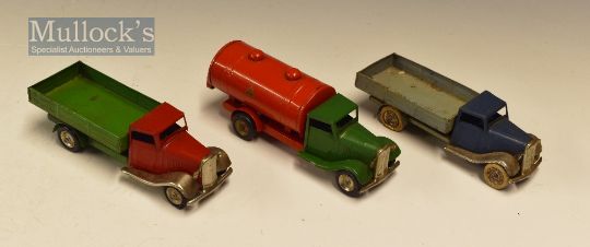 Triang Minic Clockwork Tinplate Selection to include 2x Delivery Van and one Fuel Tanker, all fixed backs, condition mixed A overall, play worn (3)