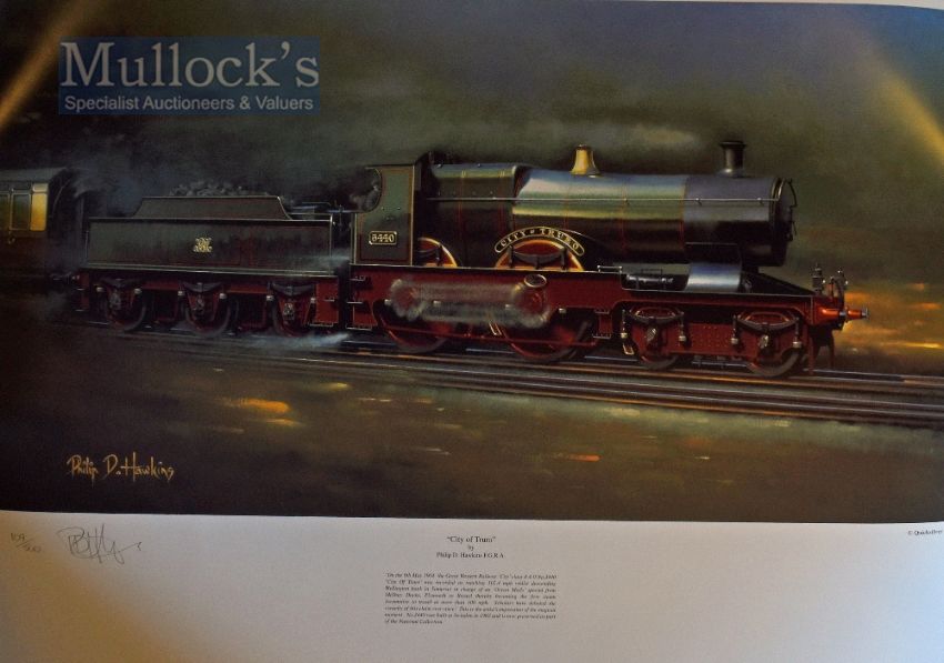 C.1895 Coloured Railway Prints by Raphael Tuck Plates I-IV entitled ‘Travelling on the Liverpool and Manchester Railway 1831 depicts Goods Trains and Passenger Trains, both framed measures 71x31cm approx. together with a Limited Edition ‘City of Truro’ Railway Print signed by the artist P.D. Hawkins 109/500 (2)
