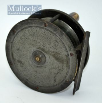 Jeffery & Son , 12 George St, Plymouth brass salmon reel – 4” dia, with makers details engraved to the plate wind together with the owners initials-retaining much of the original lacquer finish-constant check would appear to be all original