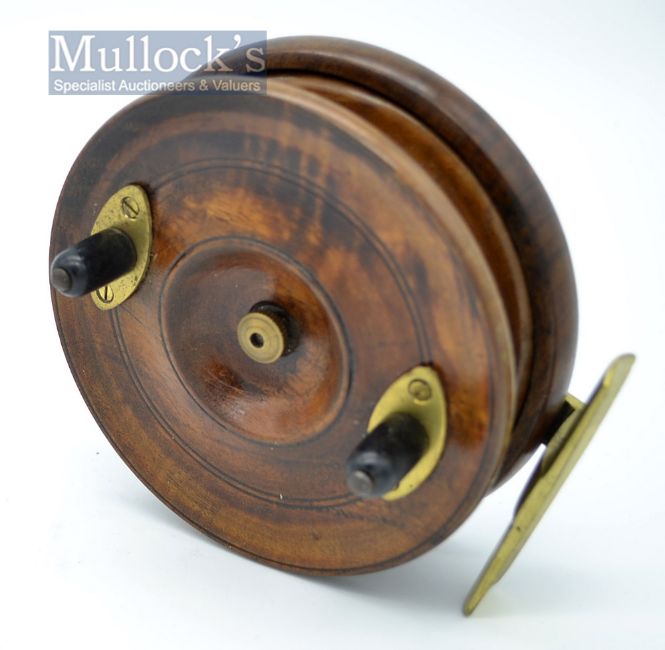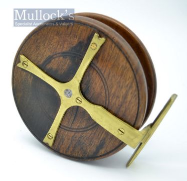 Unnamed Nottingham wooden and brass fish tail star back trotting centre pin reel – 5” dia with 2x perforations to the brass foot – runs very smoothly