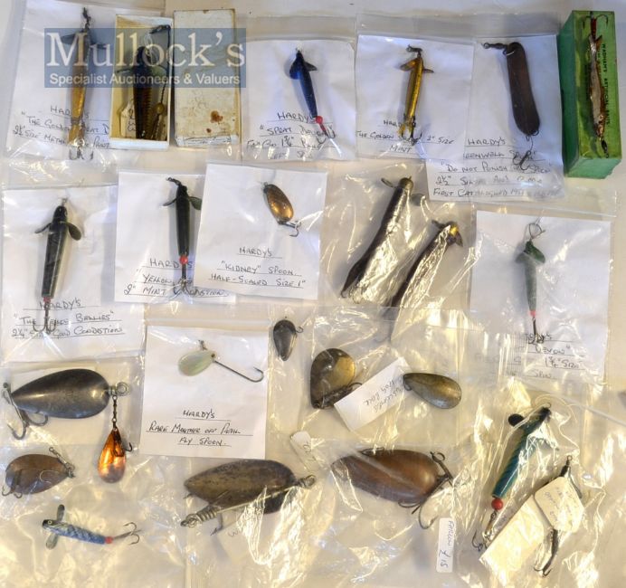 Collection of various early lures (27) – makers incl 10x Hardy incl Greenwell, boxed Pennell, leather tail, Golden Sprat, spoon; tiny Farlow & Co spoon, Munro leather tail, 4x Cummins spoons, Percy Wadham boxed; mother o’ pearl fly spoon; 2x Luscombe plus 4x others