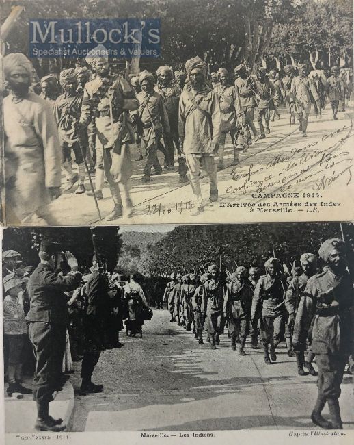 India & Punjab – Sikh Troops heading to Front in WWI Postcards Two original vintage First World War postcards of Sikhs soldiers arriving in France, and marching to the western front, in France, c.1914