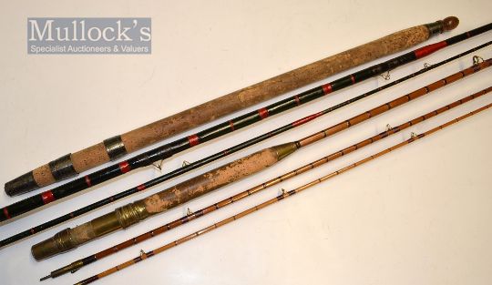 Farlow’s and Milwards split cane and whole cane rods (2): an early C Farlow & Co Makers 191 Strand London 10ft 3pc split cane fly rod c.1890 with brass winch reel fittings with sliding ring, engraved brass butt, lined butt and tip guides, new guides and tip section in cloth bag (G) and Milwards 10ft 9ins 3pc whole cane and split cane rod with detachable butt c/w wooden ferrule stopper, black finish with red whippings, tapered mid-section and whole cane tapered split cane tip section – used in fitted cloth bag