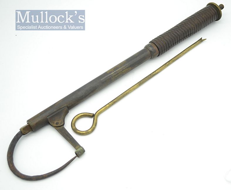 Hearder Plymouth gaff and disgorger (2) – Hearder Plymouth single draw brass gaff with point protector stamped with makers details overall 15” (closed) and Hearder Plymouth brass disgorger with name clearly stamped – overall 9.5”