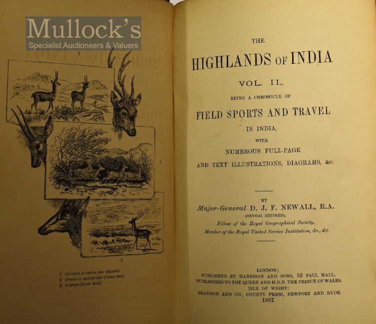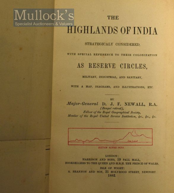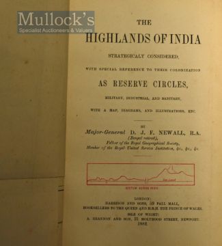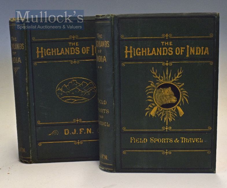 The Highlands Of India 1882 Book By Major-General D. J. F. Newall - Strategically considered with special reference to their colonization as reserve circles, military, industrial, and sanitary, with 75 illustrations [many full-page] + folding map together with The Highlands Of India Vol II, 1887 Being a chronicle of field sports and travel in India By Major-General D. J. F. Newall with 32 full-page illustrations and 201 in the text - Both volumes in original cloth binding with gilt ornamentation and bevelled edges. Original endpapers. Paper edges painted red. (2)