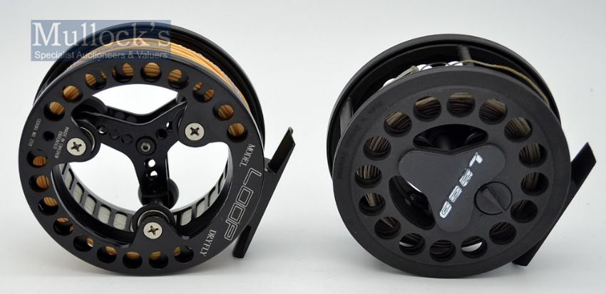 2x Loop High Tec fly reels and lines – Loop Model Dry Fly Ser No. 2711 -3.75” dia - front drag tensioner, 3 point frame, black anodised finish, c/w line and backing (G) and a light weight fibre 3.75” reel c/w line both run well