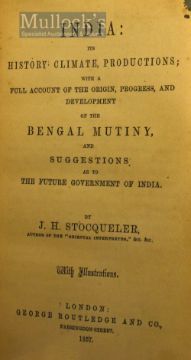 India: Its History, Climate, Productions by J. H. Stocqueler 1857 Book An interesting 219 page book with several full page illustrations. Giving fulsome account about India at that time. In marble board binding.