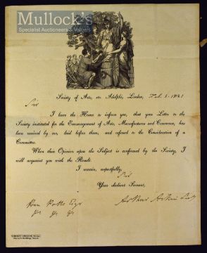 The Society of Arts Awards Its Isis Medal 1820 Addressed to Miss M. Copland inviting her to attend the award committee to demonstrate her skill (she was awarded the medal, in class 2 for a landscape in oil). Allegorical vignette Isis and Britannia with kneeling supplicant submitting his work of art. Hand signed by Dr. Arthur Aikin (1773-1854) who studied with Priestly & specialized in mineralogy & botany. One of the founders of the Geological Society, member of Linnean Society, he was secretary of Society of Arts for 23 years from 1817. Size 7¼” ´ 10”.