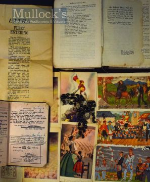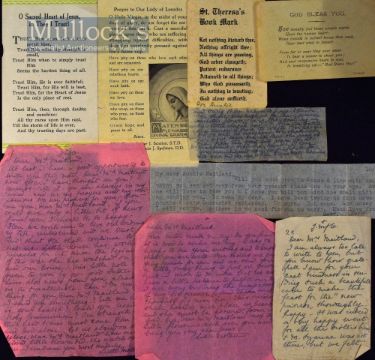 WWII - 1938 Hong Kong Passport for Mrs A Maitland whom was held within the British Civilian Internment Camp, Stanley Hong Kong - with Asian paper Bookmark, with a 1945 Extra Fleet entering newspaper article explaining that the formal surrender is likely to follow, with many hand written notes to Mrs Maitland, some presumably whilst she was detained, Cross made from a vine, and various prayer cards included etc., a selection of 14x Postcards and black Rosary necklace – condition G overall, worth inspecting (Qty)