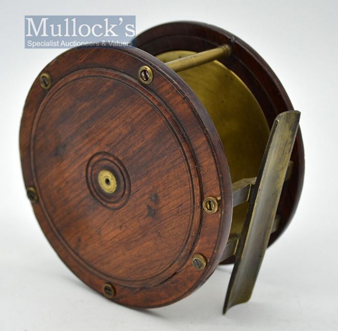 Scottish “Perth Pattern” rosewood and brass wide drum salmon reel - 4.5” dia brass wide drum - engraved to the face plate H.W Pople Perth, revolving pillar guides, horn handle, smooth brass foot some filing to one end otherwise fairly straight - constant check - some grain cracks to the front rim and back plate – very solid and turns smoothly