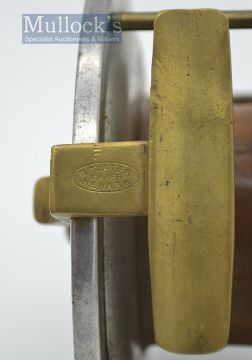 D. Slater Nottingham combination wooden, alloy and brass star back reel – 4.5”dia with on/off check button, rear alloy drum flange, brass pillar and drum frame – slight play in the drum but turns smoothly – very slight filing to end of each foot