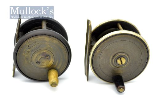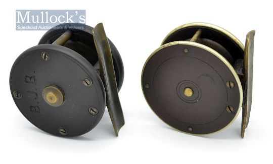 Carter & Sons London and one other small brass and ebonite trout fly reels (2) – A Carter & Sons Makers London 2.25” dia – wide drum, with brass pillars and drum frame – constant check – owners initials B.J.B engraved to the ebonite back plate - slight knock to brass foot – turns smoothly; and unnamed 2.25” brass, ebonite combination reel with nickel silver rims, brass pillars, ebonite drum frame – constant check – turns smoothly – tiny kink to brass foot