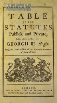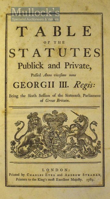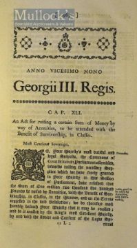 1789-1790-1791-1794 Acts of Parliament – 40 Acts in one volume each with separate title page with Royal Arms. Including Acts of Importation of Bread, Indian corn from any territories belonging to the United States of America into Quebec and to the Coast of Labrador; for discontinuing the Judgement which has been required by Law to be given against women convicted of certain crimes; for regulating the Importation and Exportation of Corn and of the Bounty of British Corn, London printed by Charles Eyre and Andrew Strahan, Printers to the King’s most excellent Majesty, County of Brecon, covers appear Good, intact and internally sound