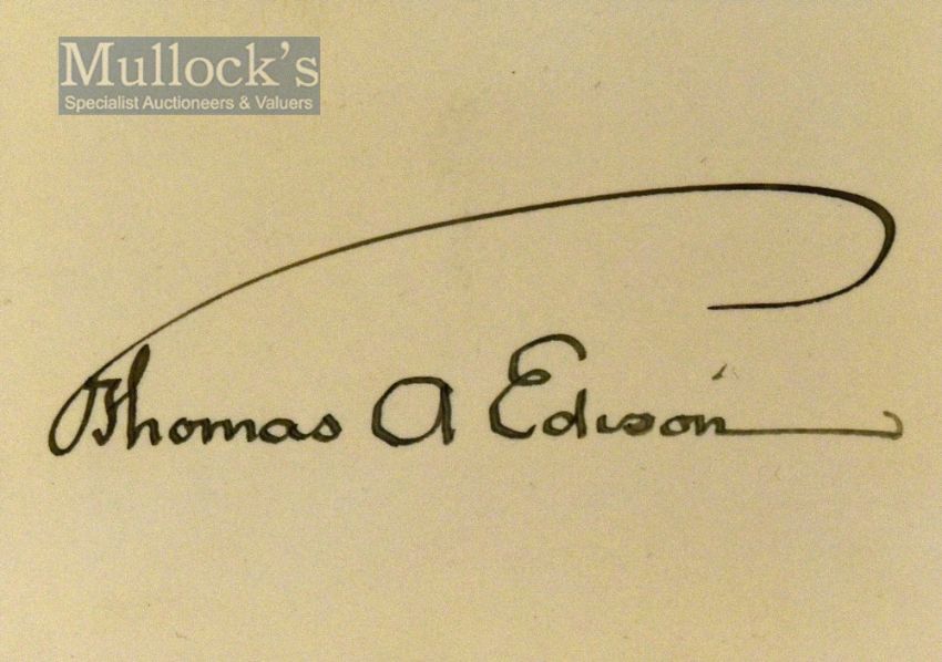 Autograph – Thomas A. Edison (1847-1931) Signed Cutting – bolding signed to front, plus a page of the autograph album it originated from, measures 5x7cm approx. Edison was an American inventor and businessman, described as America’s greatest inventor. He developed many devices in fields such as electric power generation, mass communication, sound recording and motion pictures.