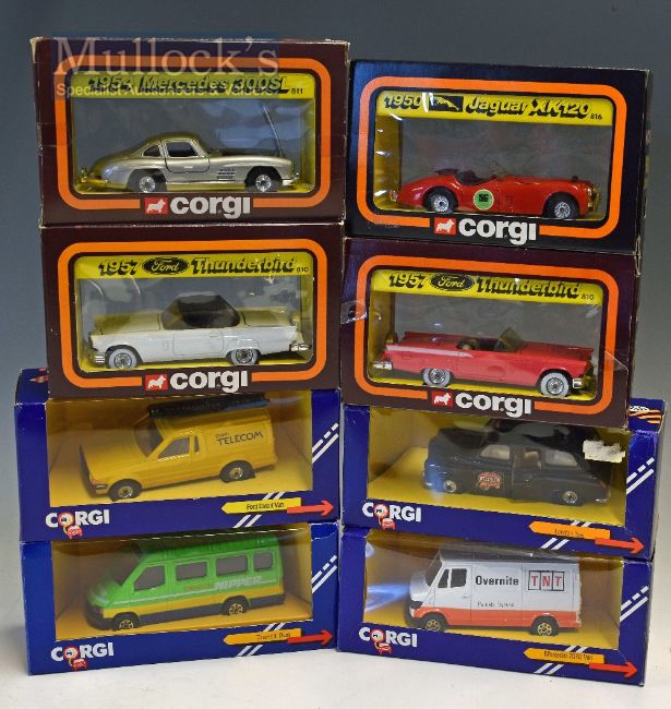 Corgi Toys Diecast Models to include Cars of the 50’s 1957 Thunderbird (2), 1954 Mercedes 300SL, 1950 Jaguar XK120, plus 425 London Taxi, C576/9 Mercedes 207D Van, 496/19 Ford Escort and C676/12 Transit Bus – all boxed in good condition (8)