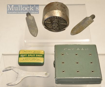 Interesting Fishing Accessories (6) – Hardy Alloy Rod spanner, 2x unnamed alloy butt spears, Martin James Split Shot Tin, “Fly Box” alloy clip fly tin and Modern Arms Co Die Cast stamp featuring the Modern Fishing Man – neat little lot