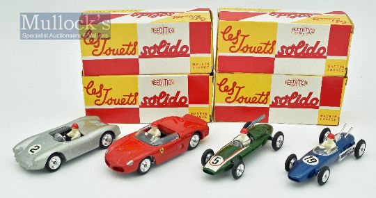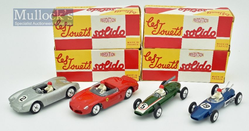 Solido Reedition Diecast Model Toys to include Porsche Spyder 1955 1106, Ferrari 2.5L 1108, Lola ClimaxV8 F1 1962 1103, and Cooper F2 1959 1102 all boxed in good condition overall (4)