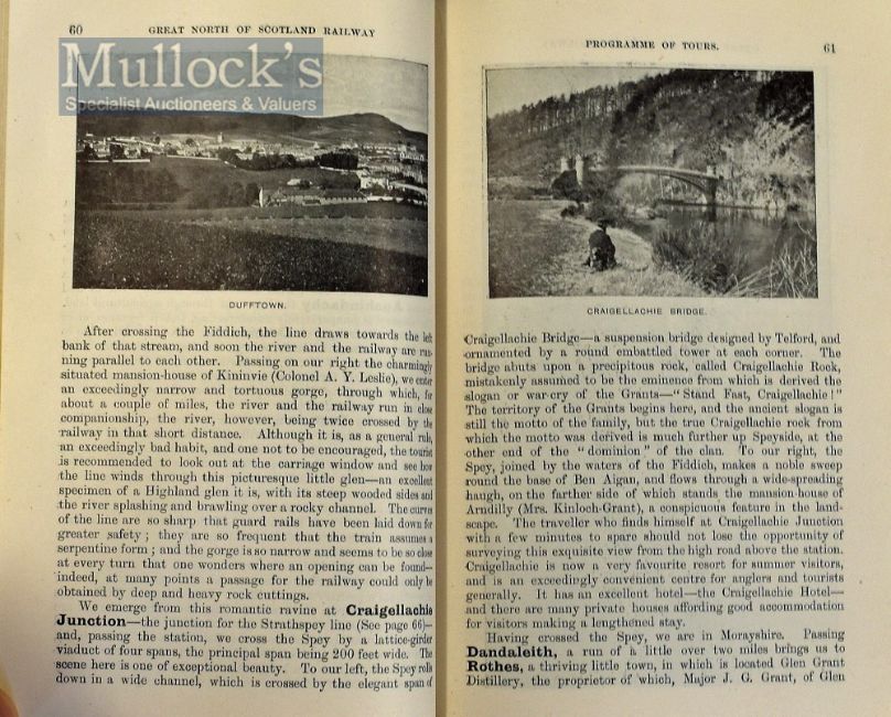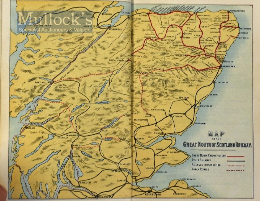 Great North Of Scotland Railway. Royal Route To The Highlands Via Aberdeen. Tourist Season 1896 - An extensive 214 page publication full of photographs, time tables, maps and details of various circular tours by Train, Steam Ship and Horse drawn coach etc. Also many adverts for Hotels some with engraved illustrations. In cloth board cover, size 5” × 7¼”.