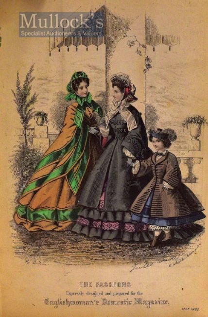 English Woman’s Domestic Magazine 1862 Book 6 Monthly editions with 6 Multicoloured fashion plates. With total of 286 pages. Detailing ladies fashions of the period and other various articles. In original cloth boards with gold tooled spine, size 5½” ´ 8½”.