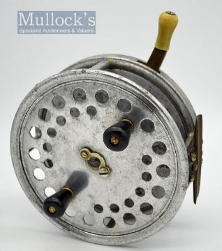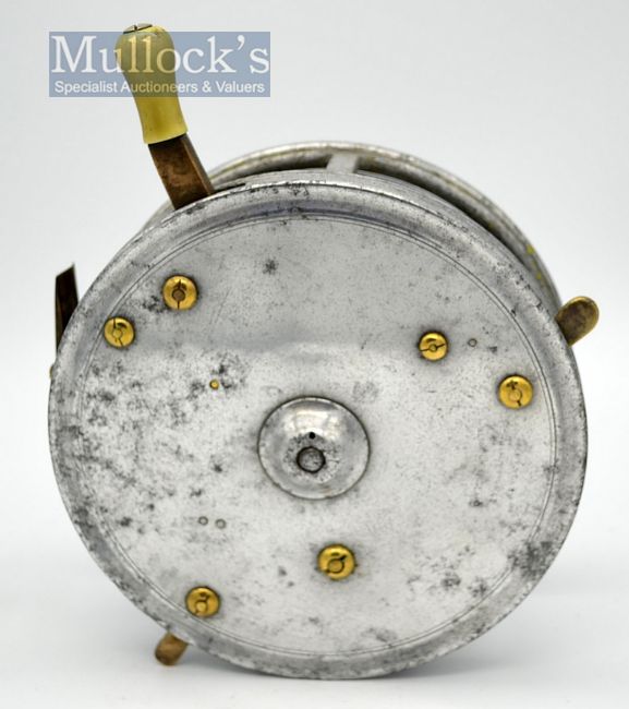 Early Hardy Bros “The Sea Silex No.2” large alloy sea reel c.1914 – 7” dia – but with three rim controls, tapered black handles, heavy duty telephone latch, smooth brass foot – makers details worn but No. 2 is just visible – used reel but has suffered some corrosion – never the less everything works